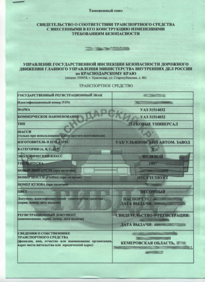 Свидетельство СКТС, образец